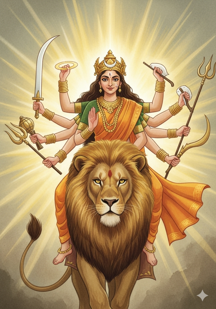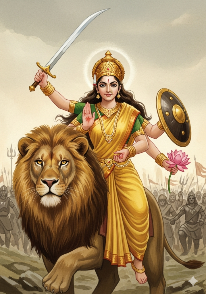कात्यायनी माता सिंह पर सवार होकर खड्ग धारण करती हैं। वह न्याय और शक्ति की प्रतीक हैं।