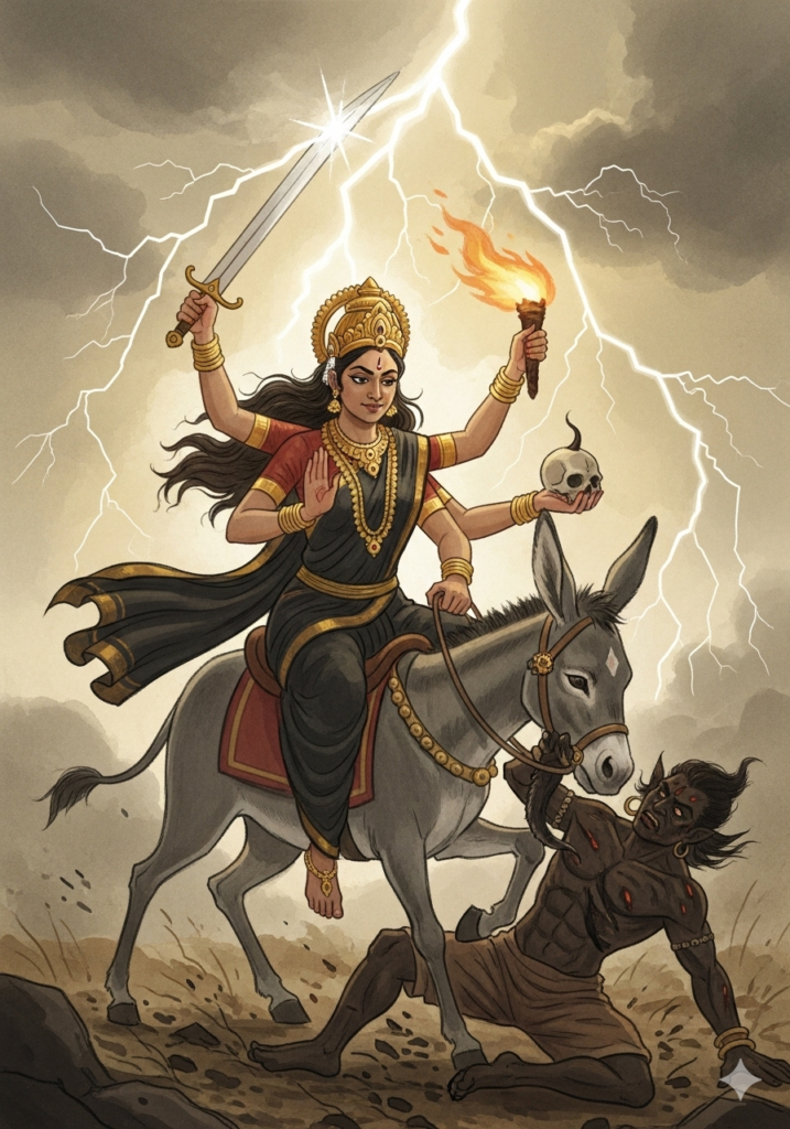 कालरात्रि माता का स्वरूप गहन काला है, किंतु वह करुणामयी हैं। वह बुरी शक्तियों का नाश करती हैं।