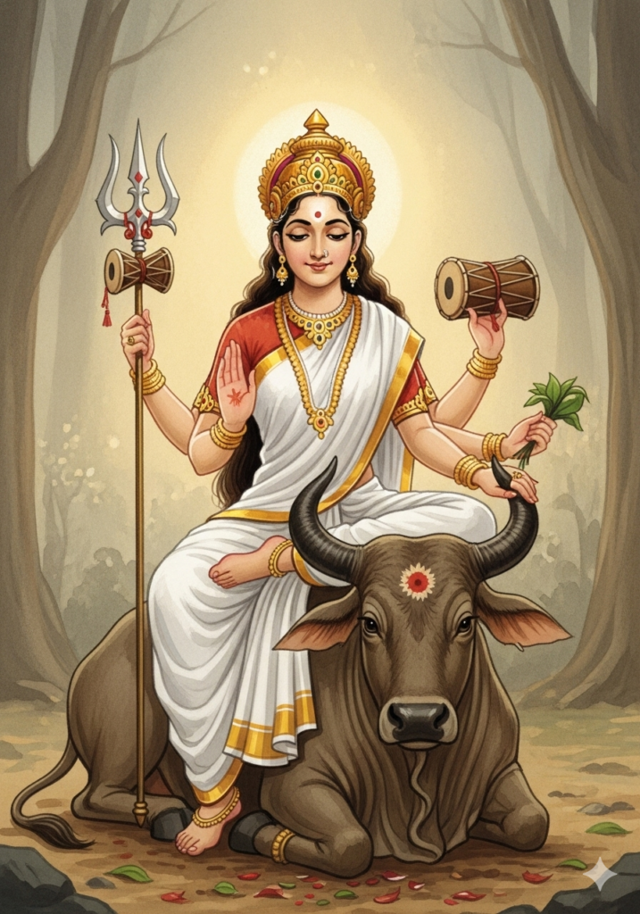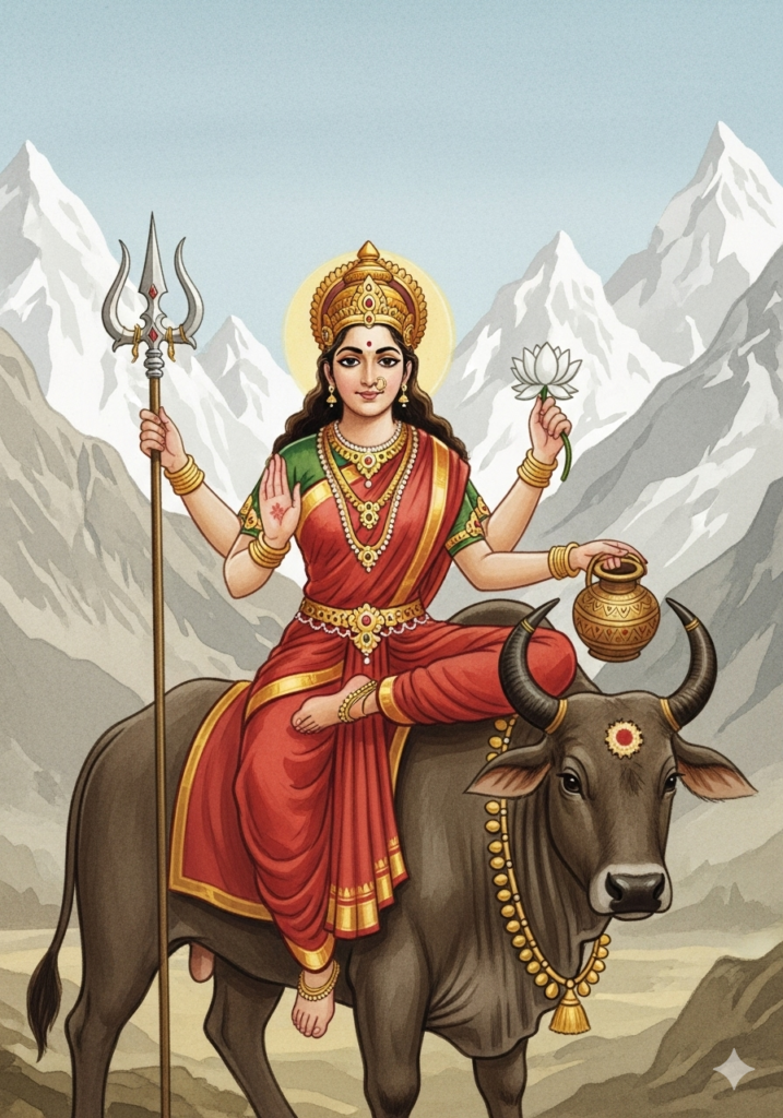 शैलपुत्री माता हिमालय की पुत्री हैं और वृषभ पर विराजमान होती हैं। उनके हाथ में त्रिशूल होता है। वह हमें दृढ़ता और समर्पण का संदेश देती हैं।
